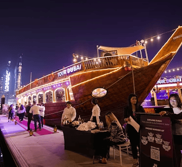 Yolculuğunuza sıcak bir Arap karşılamasıyla başlayın. Serinletici bir içeceği yudumlayın, tatlı hurmaları atıştırın ve su üzerinde bir gece için yerleşin. Şehir silueti manzaraları için esintili üst güverteyi veya AC bulunan rahat alt güverteyi seçin. Bir zahmetsiz seyahat mi istiyorsunuz? Kolay karşılama için ortak gidiş-dönüş otel transferleri ile yükseltin.